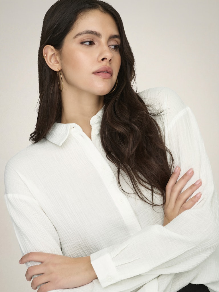 Minimalistisch und zugleich raffiniert glänzt dieses Oberteil durch kleine Details wie verdeckte Knopfleiste und gerundete Saumlinie – ein echtes Lieblingsteil für viele Outfits.