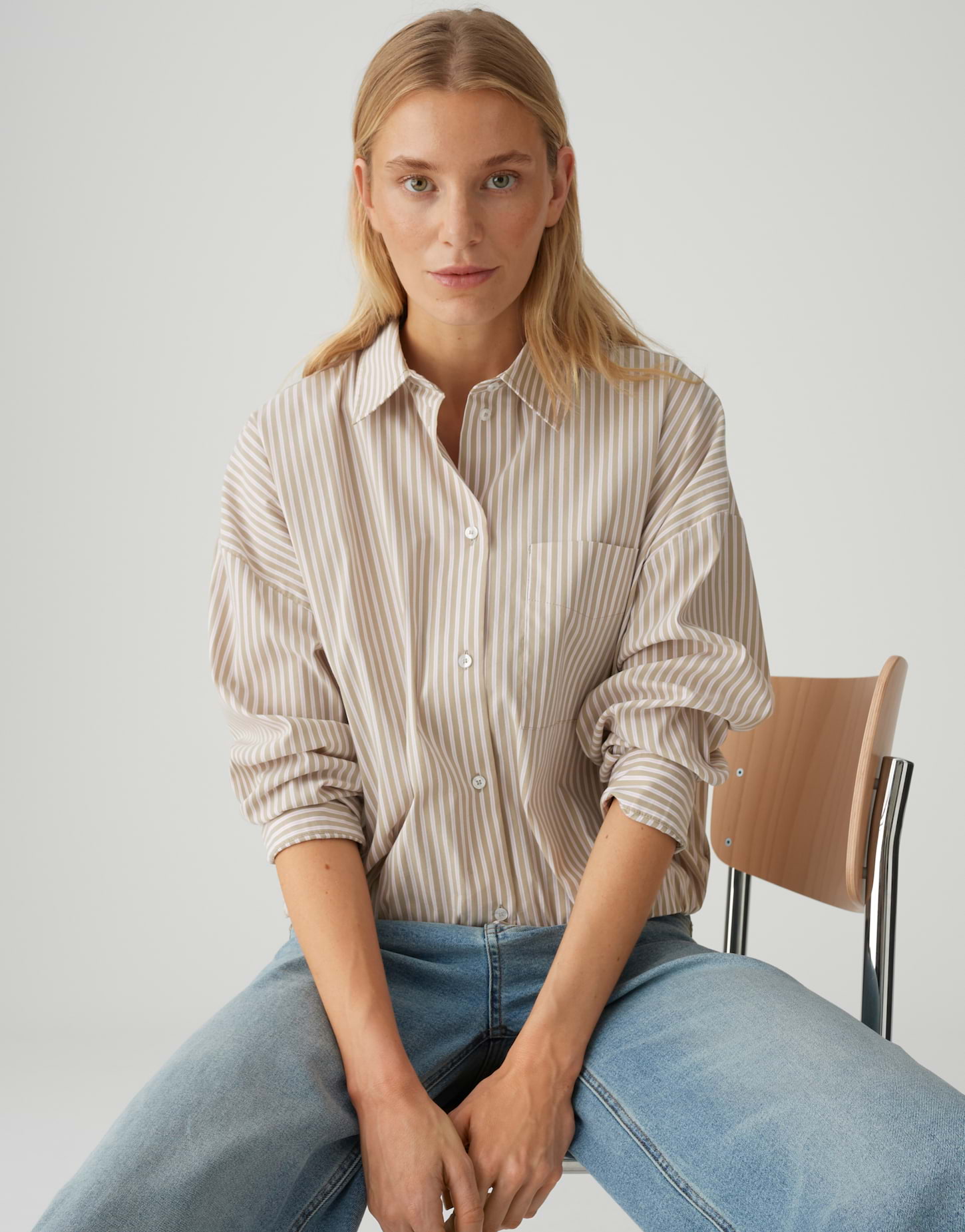 lockere Passform, ovaler Schnitt, überschnittene Schulter mit Langarm, Hemdblusenkragen, Rückenlänge ca. 54,5 cm bei Größe 36, Model Größe 176 cm - trägt Größe 36, Webware, glatter Griff, pflegeleicht, aufgesetzte Brusttasche, geraffter Ballon-Saum, Knopfleiste, Streifenmuster