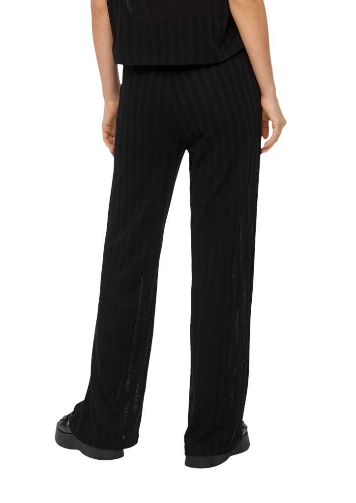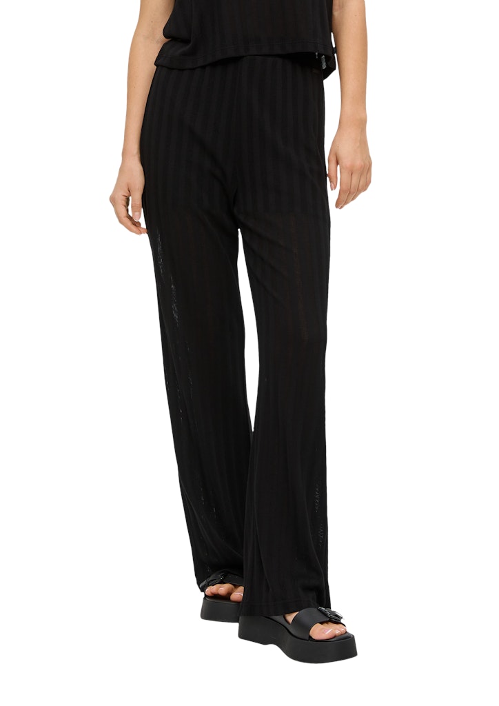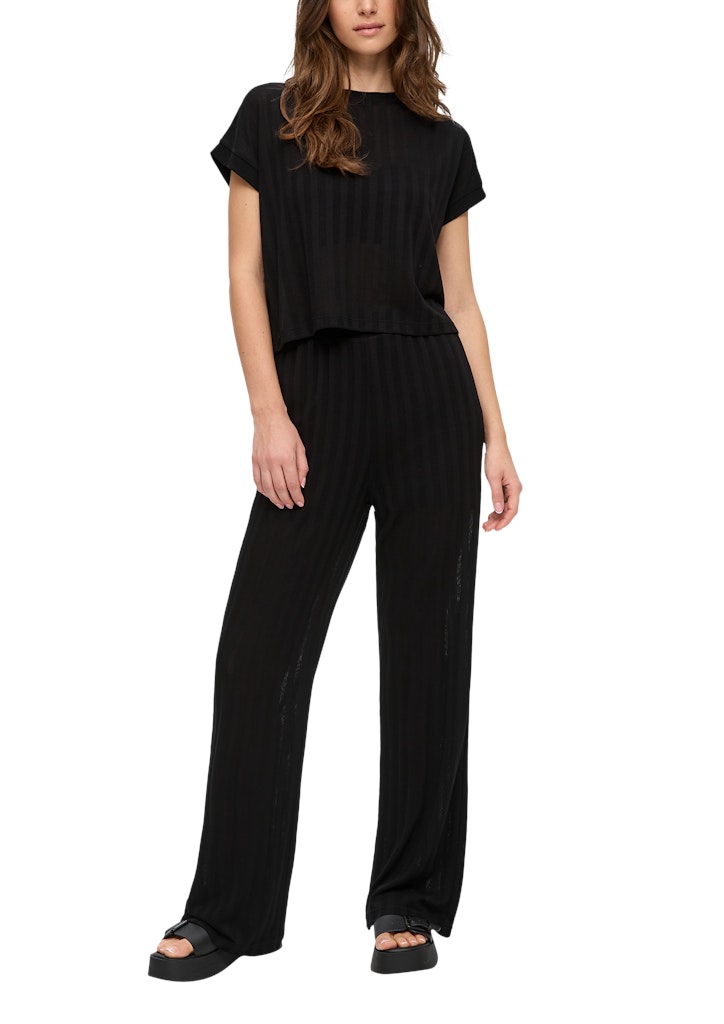 Entdecke die Hose schwarz, eine perfekte Kombination aus Stil und Komfort. Diese semitransparente Damenhose beeindruckt mit einem trendigen Strukturmuster und verleiht deinem Outfit eine subtile Eleganz. Der weiche Stoff sorgt für ein angenehmes Tragegefühl, während die weite Passform sowohl luftig als auch modern wirkt. Der elastische Bund in der Mitte der Taille schmeichelt deiner Figur und bietet eine bequeme Passform den ganzen Tag über.