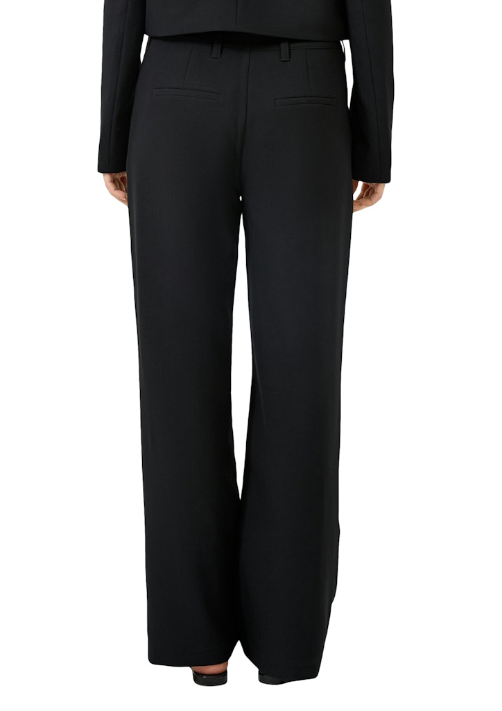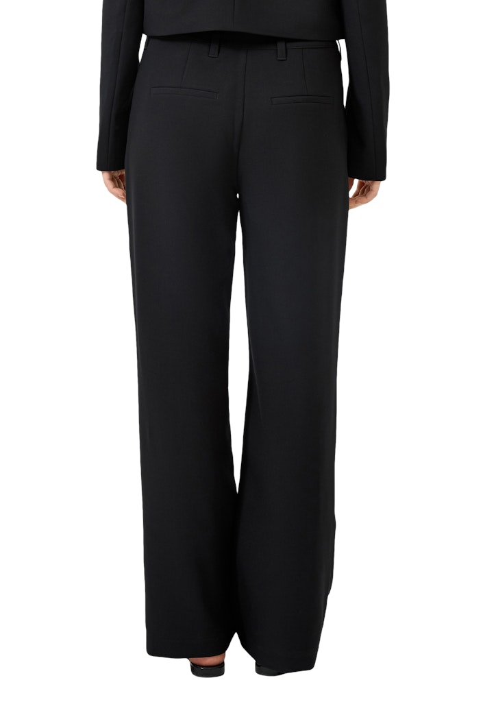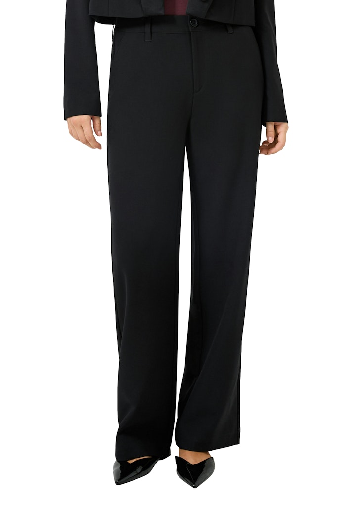 Entdecke die Hose schwarz, dein perfekter Begleiter für vielseitige Anlässe. Diese stylische Wide Leg Hose aus der QS x Vanessa Mai Kollektion vereint fließenden Twill-Stoff mit einem lässigen Schnitt, der sowohl im Business-Meeting als auch auf der After-Work-Party überzeugt.
