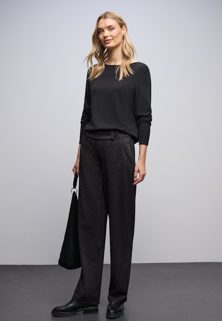 Ob du ein schlichtes Basic-Shirt für einen minimalistischen Style wählst oder ein funkelndes Top für den Abend – mit der Glitzernden Straight Leg Hose black bist du immer passend gekleidet. Der hochwertige Stoffmix lässt dich den ganzen Tag komfortabel und stilvoll unterwegs sein.