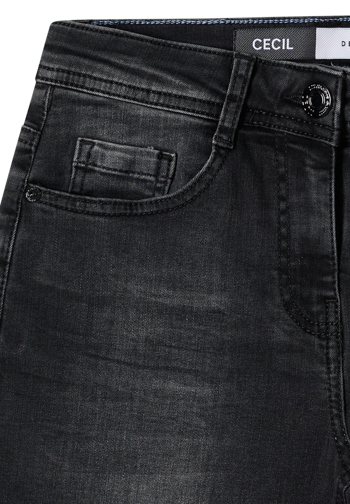 Hergestellt aus einem hochwertigen Baumwollmix mit einem leichten Stretchanteil, bietet diese Jeans von CECIL den ganzen Tag über maximalen Komfort und Flexibilität. Die schwarze Waschung verleiht der Jeans eine vielseitige Optik, die sich perfekt mit nahezu jedem Outfit kombinieren lässt.