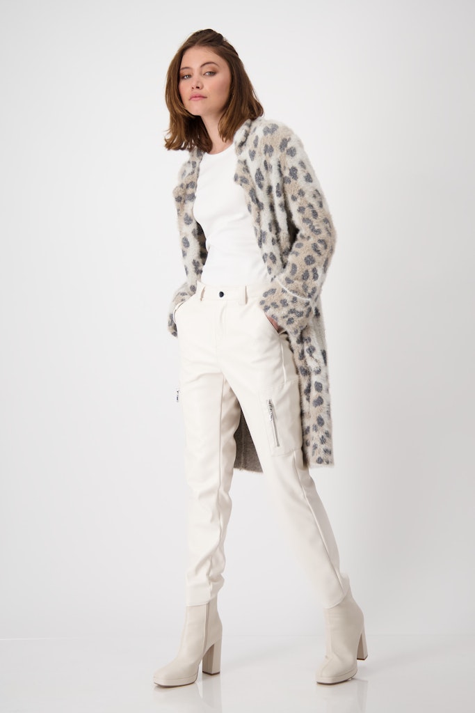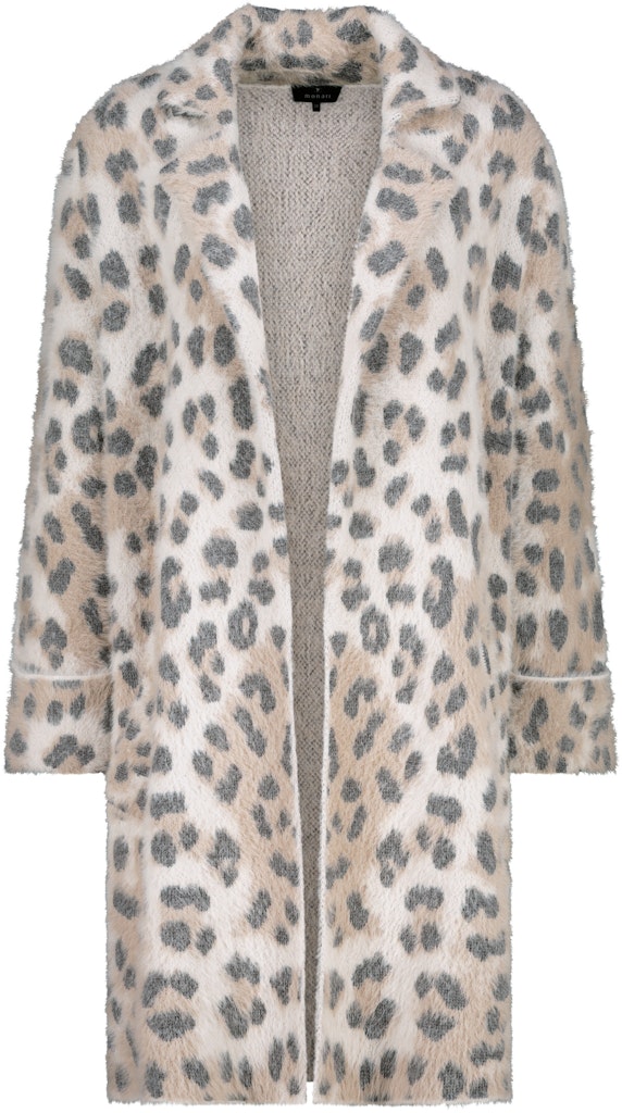 Der flauschiger Mantel aus Plüsch überzeugt mit seinem allover Leomuster aus Jacquard Stoff. Er ist verschlusslos und verfügt über praktische seitliche Eingriffstaschen.