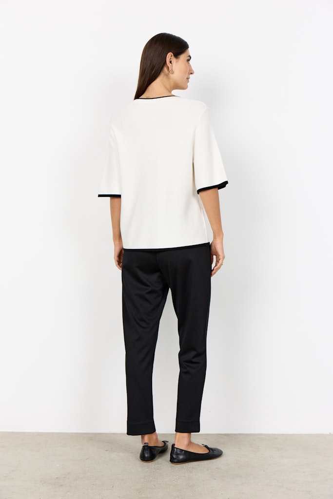 Der SC-DOLLIE 793 ist ein eleganter Damenpullover von Soyaconcept, gefertigt aus 75% Viskose und 25% Nylon. Mit seinem runden Halsausschnitt, dem kontrastierenden Saum und den kurzen Ärmeln verbindet er feinen Strick mit einem klaren, femininen Schnitt. Der Pullover lässt sich mühelos zu einer maßgeschneiderten Hose oder einem eleganten Rock kombinieren und eignet sich sowohl für Office-Looks als auch für entspannte Freizeitoutfits.