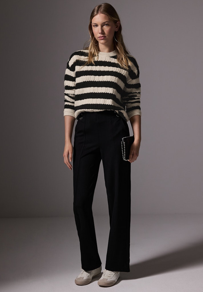 Mit seinem klassischen Rundhalsausschnitt und den langen Ärmeln lässt sich der Strukturpullover vielseitig kombinieren. Ob zu Jeans, einem Rock oder als Layer unter einer Jacke – dieses Kleidungsstück passt zu jedem Stil und Anlass.