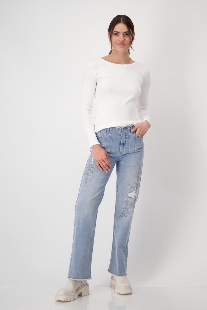 Besonders beliebt sind die ausgefallenen Oberteile mit Materialmix und Applikationen. Wenn Du nach einem Look mit Balance aus Alltagstauglichkeit und besonderem Stil suchst, dann ist Monari eine kluge Wahl.