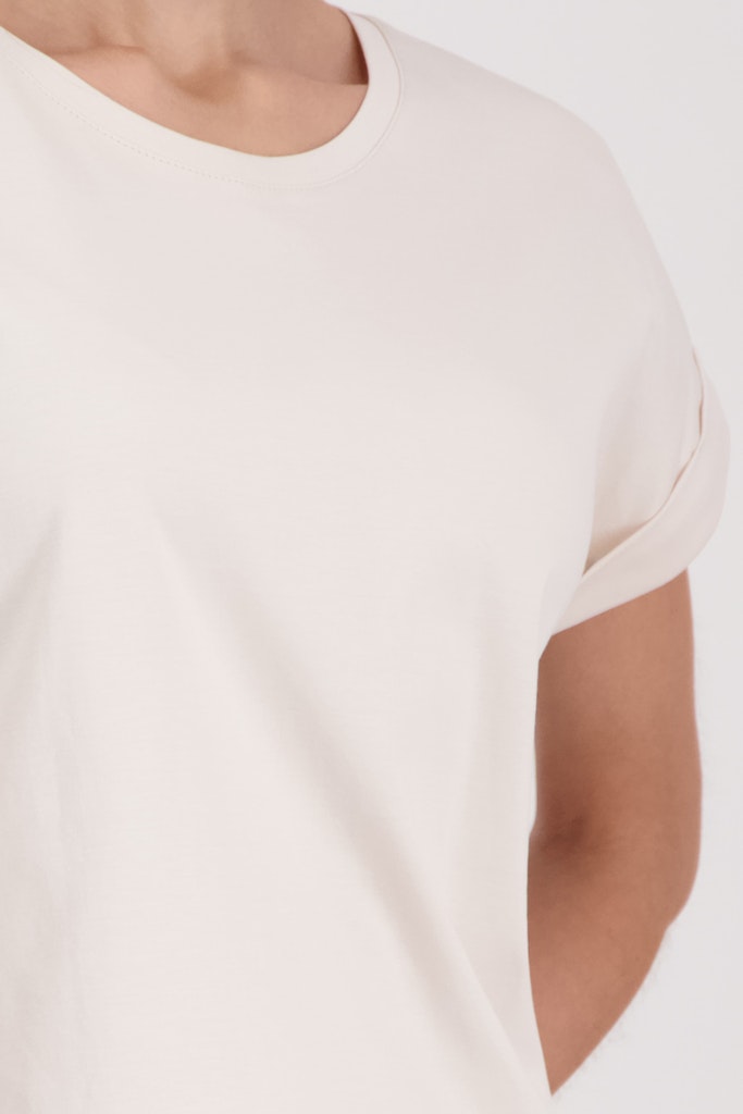 Das Basic-T-Shirt besteht aus 100% Baumwolle und hat kurze Ärmel mit Ärmelaufschläge.
