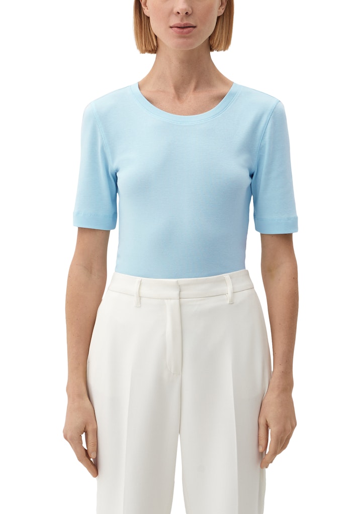 Entdecke unser feminines T-Shirt aus einem luxuriösen Mix aus 50% Baumwolle und 50% Modal. Mit seinem cleanen Look und dem Slim Fit Schnitt ist dieses Shirt der perfekte Begleiter für lässige Alltagsoutfits. Die halblangen Ärmel und der klassische Rundhalsausschnitt verleihen diesem hochwertigen Basic eine zeitlose Eleganz. Ob solo getragen oder unter einer Strickjacke kombiniert, dieses vielseitige T-Shirt passt zu jeder Gelegenheit. Wandle spielend zwischen Casual und Chic und sei mit diesem Must-Have immer im Trend. Spüre den Komfort und die Qualität dieses Allrounder-Shirts und sei bereit, dein Outfit auf das nächste Level zu bringen. Worauf wartest du?