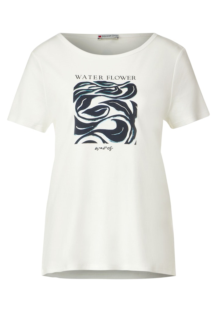 Dieses T-Shirt mit Print für Damen von Street One ist ein bequemes Piece mit Rundhalsausschnitt, das durch seinen Frontprint mit Glitzer-Details eine glamouröse Note bekommt. Der Baumwoll-Modalmix sorgt für angenehmen Tragekomfort. T-Shirt Schimmernder Partprint Baumwoll-Modal Mix Rundhalsausschnitt Interlock Material: 50% Baumwolle, 50% Modal