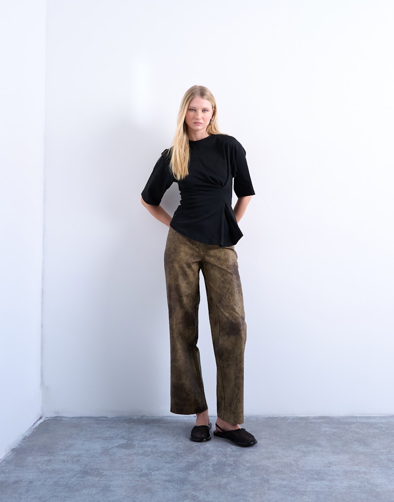 Angenommen, du suchst einen modernen City-Look für Büro und After-Work. Im Tara-M Onlineshop wählst du im Bereich Topshop zunächst eine markante Hose mit modischer Silhouette. Ergänzend entdeckst du ein schlichtes, hochwertiges Oberteil von Topshop, das den Schnitt der Hose ruhiger wirken lässt.