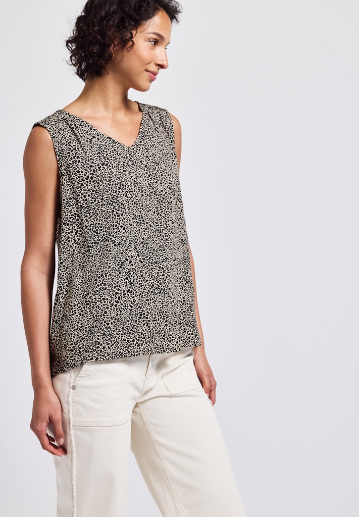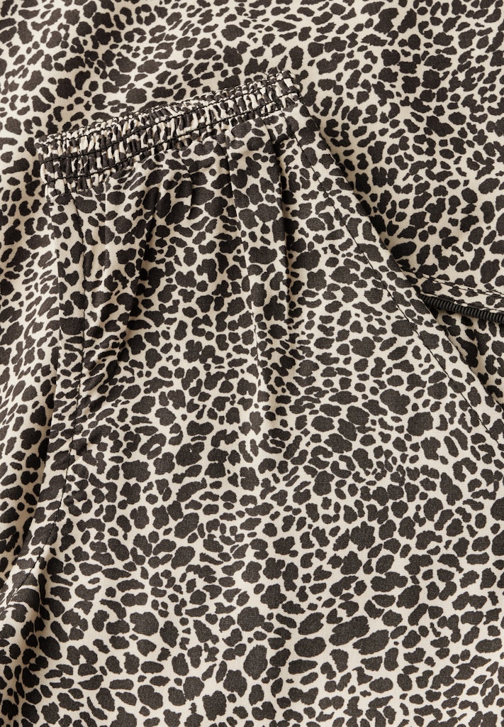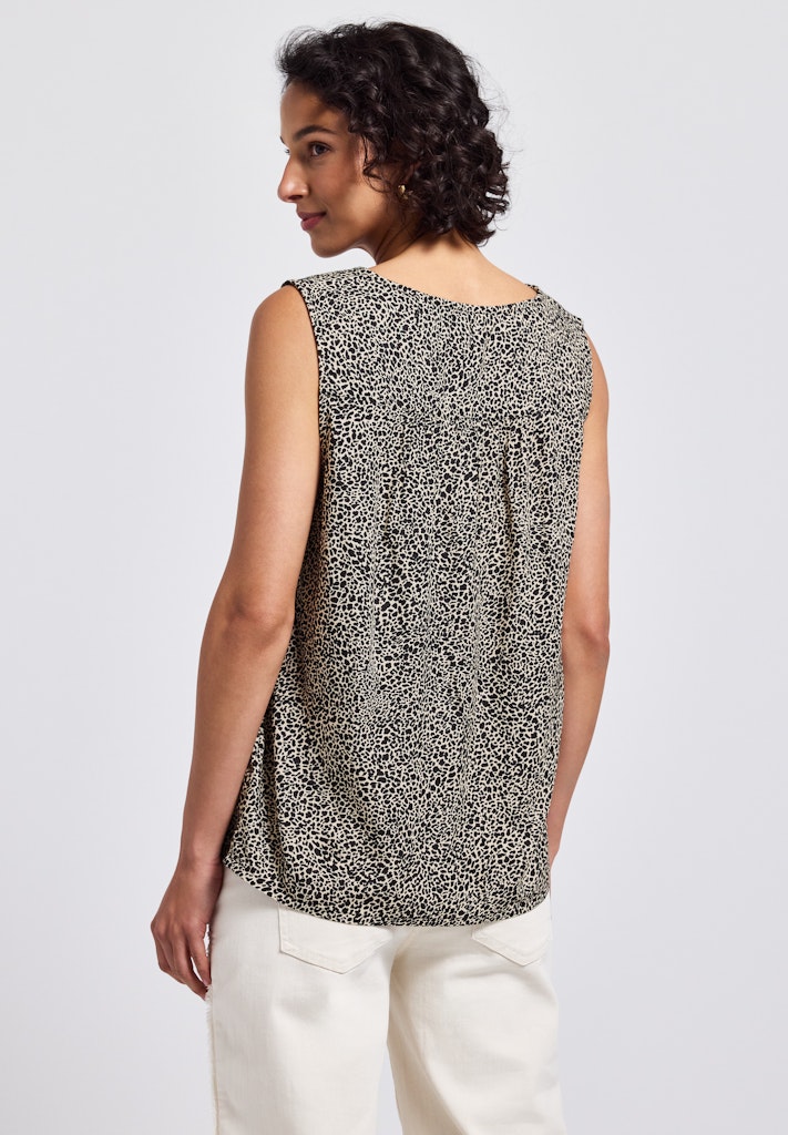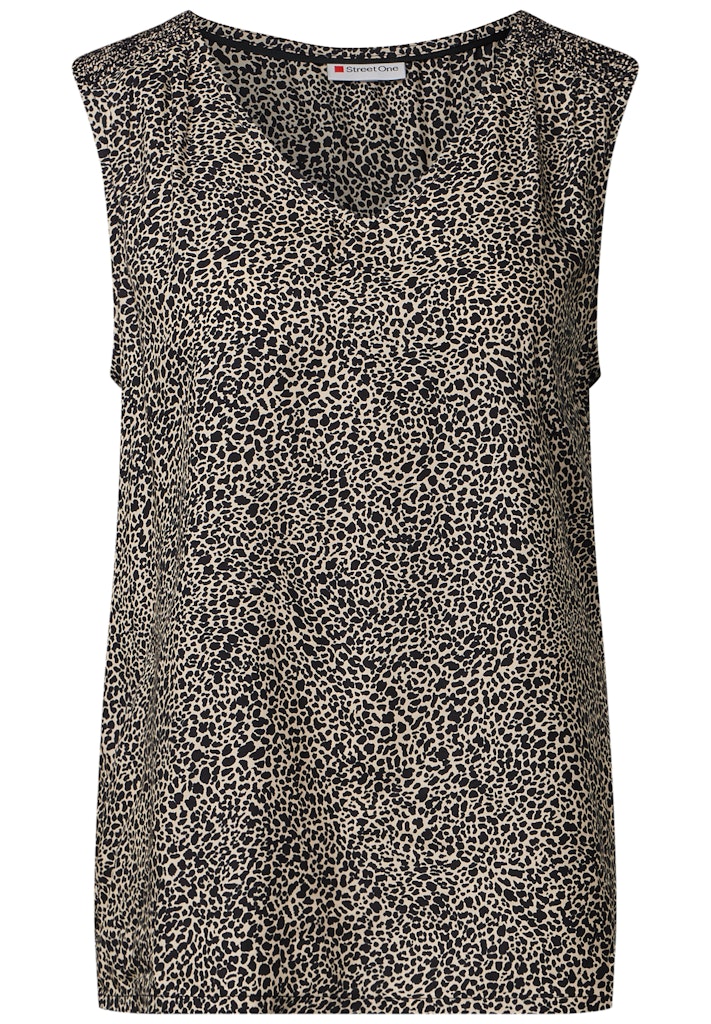 Entdecke die stilvolle Leo-Bluse mit Smock-Details, die perfekt für sommerliche Tage geeignet ist. Mit ihrem trendigen Animal Print und den femininen Smock-Details an den Schultern setzt diese ärmellose Bluse modische Akzente und sorgt für einen luftigen und komfortablen Tragekomfort.
